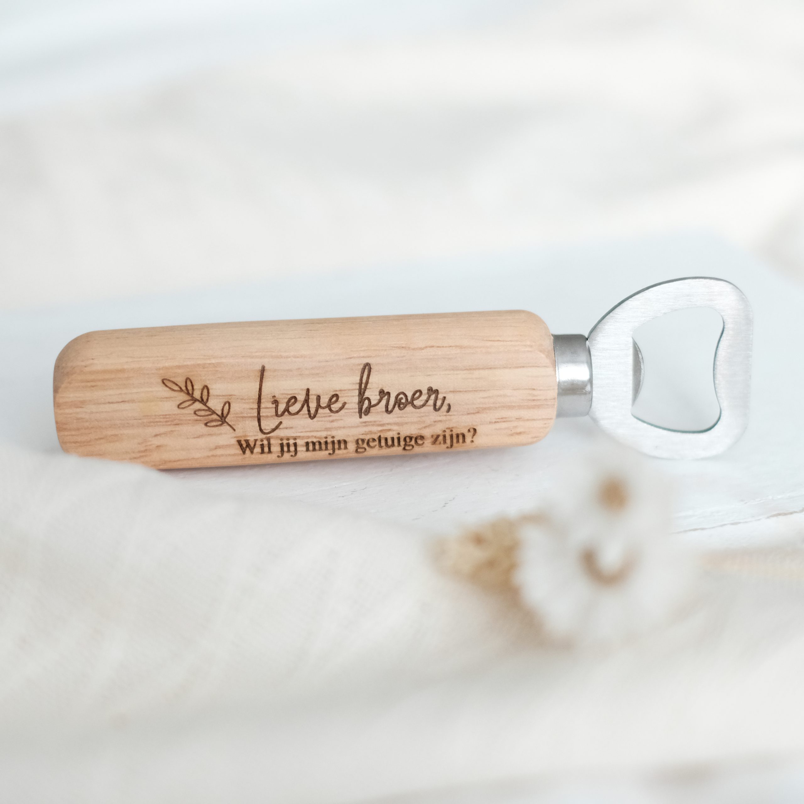 Deze flesopener heeft een houten handvat en een roestvrijstalen opener waardoor hij er luxe uitziet. Je kunt hem laten graveren naar wens. Jij bedenkt de tekst en wij zorgen ervoor dat deze mooi op de opener gegraveerd zal worden. De tekst op de productfoto geeft weer hoe het eindresultaat eruit zal komen te zien. Dit is een perfect artikel voor wanneer je op zoek bent naar een klein cadeautje. Leuk om bijvoorbeeld je getuige te vragen of je ceremoniemeester te bedanken. Flesopeners worden ook vaak cadeau gegeven als relatie geschenk, verjaardagscadeau, voor Vaderdag of tijdens de feestdagen.